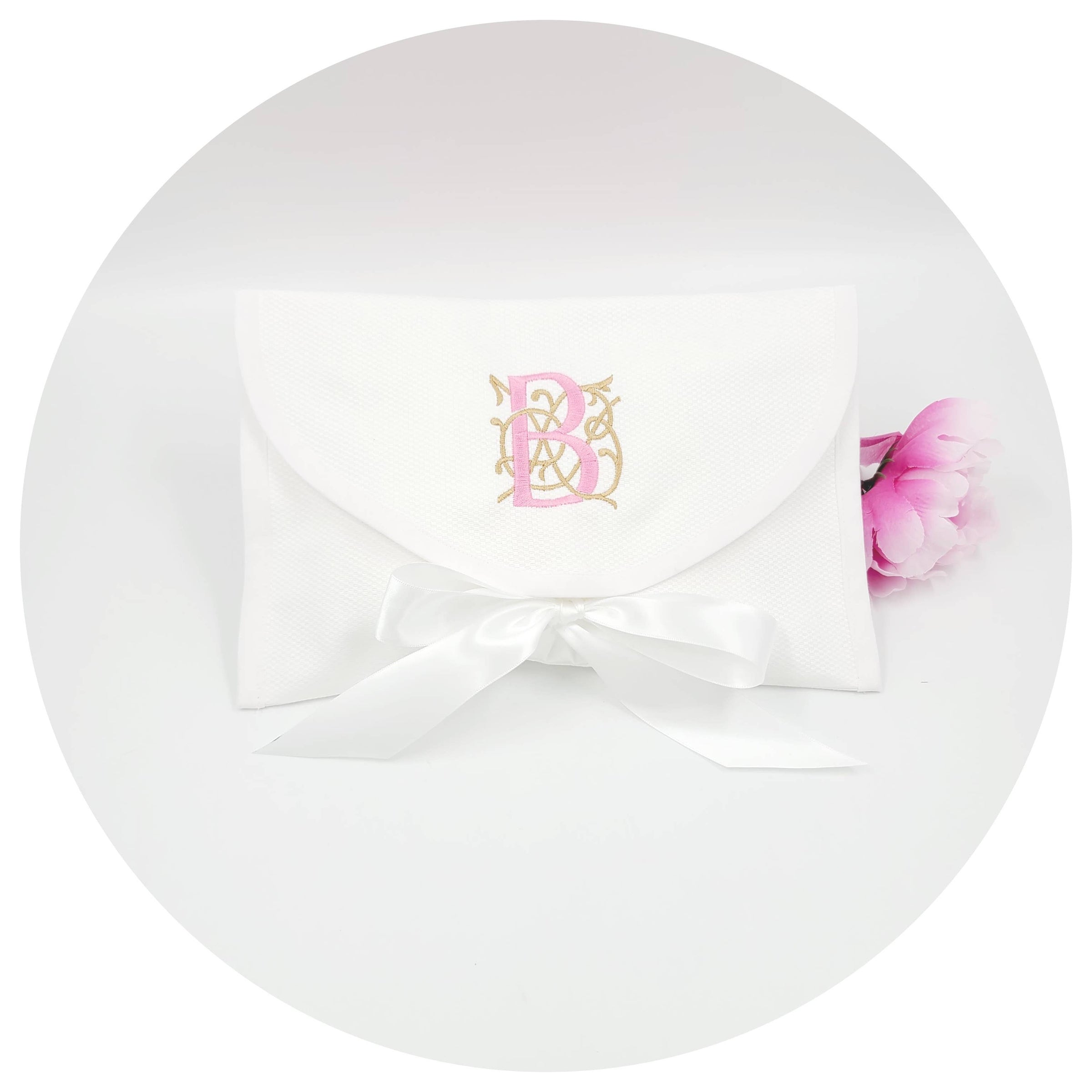 Cotton Pique envelope style bags trimmed with satin ribbon closure. Fully lined. Perfect for your most precious keepsakes! Medium bag measures 12 x 8 inches.