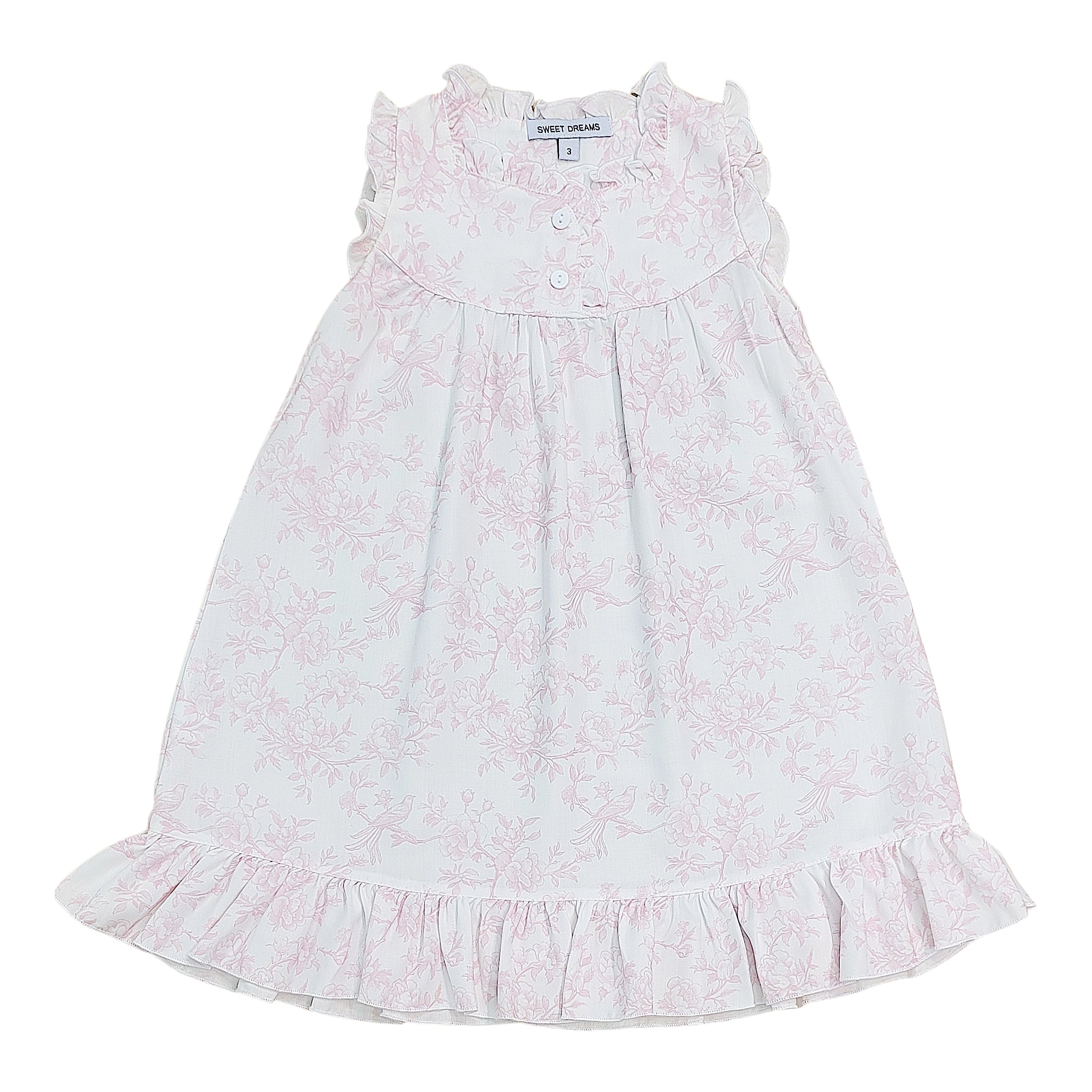 Sweet dreams start with the softest little details. This darling pink toile nightgown features a delicate floral print with charming birds and blooms, creating a timeless look that feels both classic and cozy.