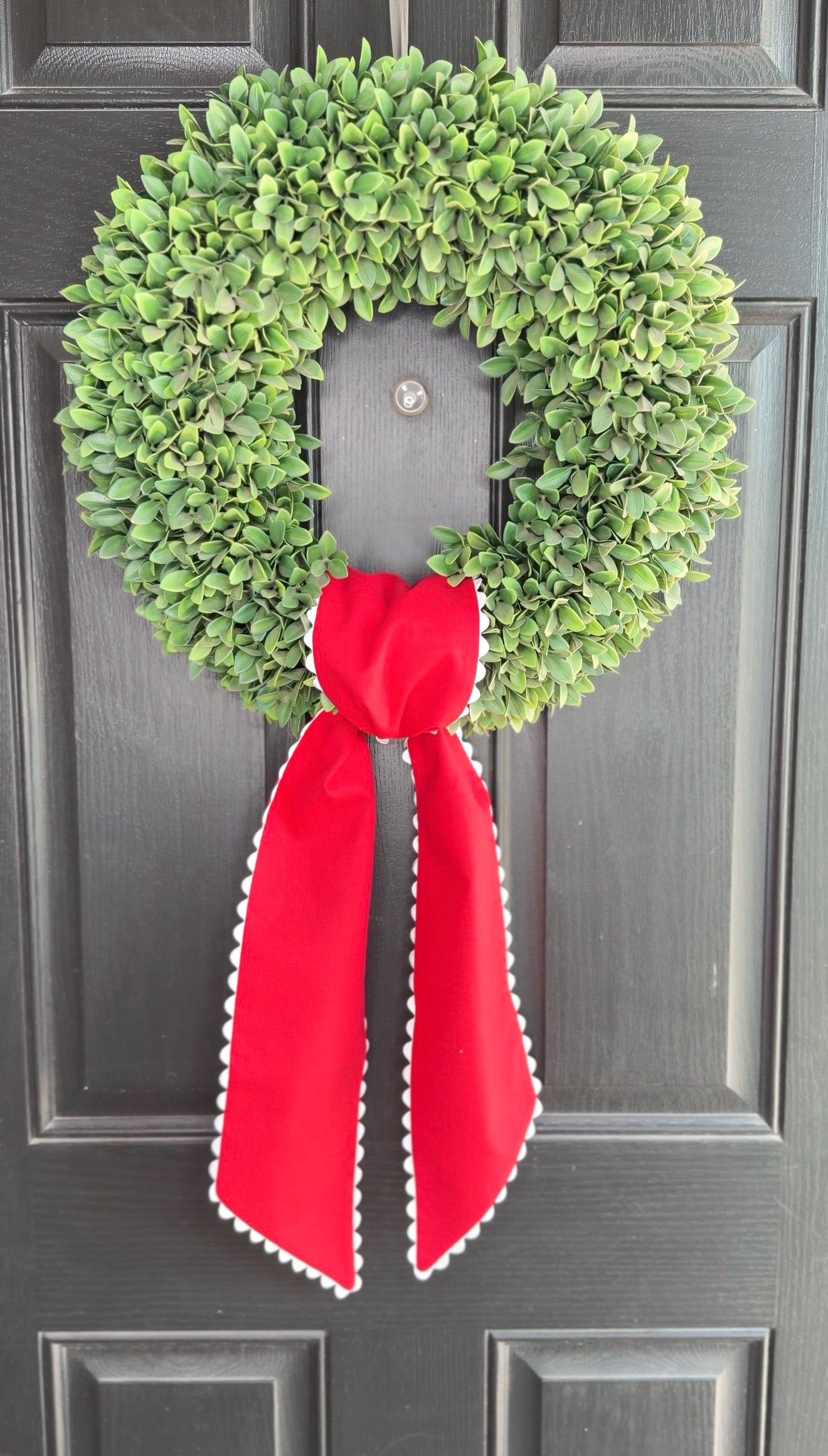 Red wreath sash with white ric rac trim a classic, embroidered holiday accent to add warmth and charm to any wreath or door decor.